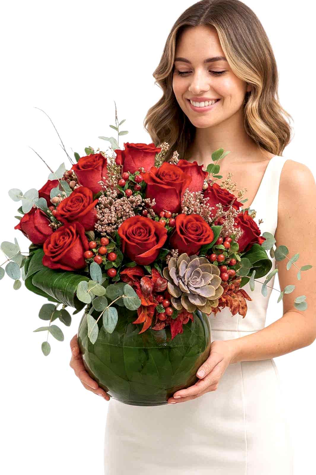 İçerik: 13 adet kırmızı gül, sukulent, okaliptus, doğal kırmızı meyveler, kuru bitki süslemeleri, yeşil yaprak kaplamalı cam vazo.