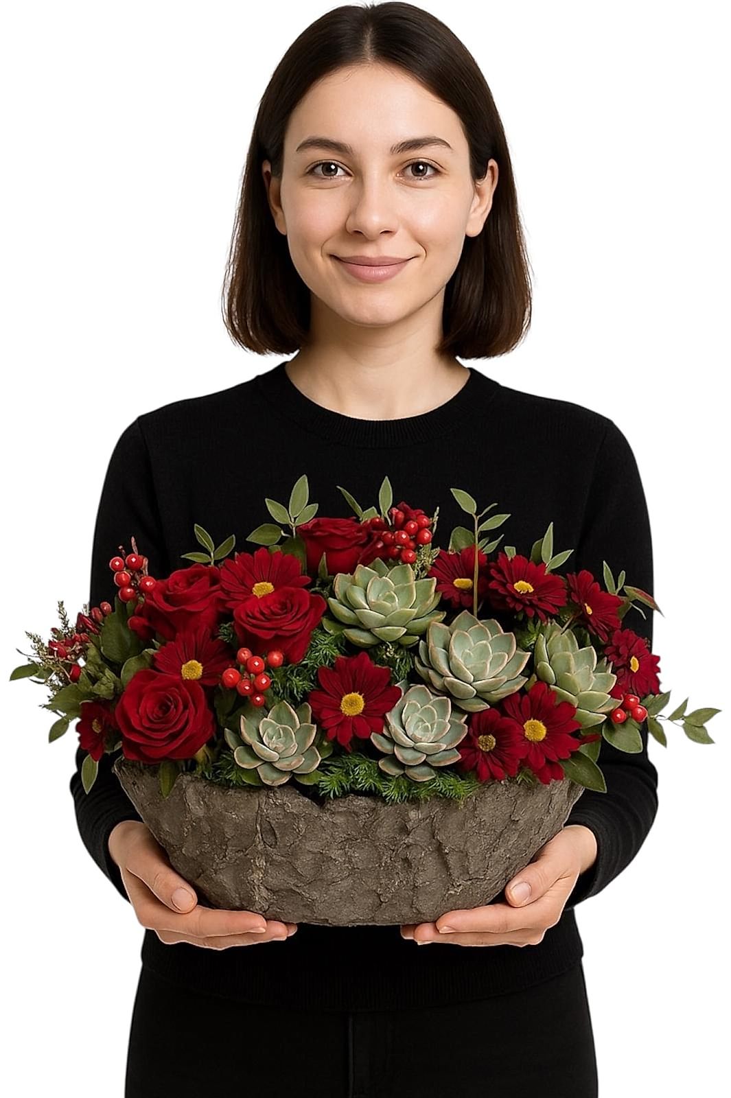 Aranjmanda yer alan sukulentler; dayanıklı yapısıyla uzun süre canlı kalabilen, modern tarzı yansıtan özel bitkilerdir. Kırmızı güller ve koyu tonlu çiçeklerle uyum içinde kullanılan kırmızı meyveler, tasarıma yeni yıl, yıldönümü ve özel gün ruhunu hissettiren bir dengeli görünüm kazandırır.
