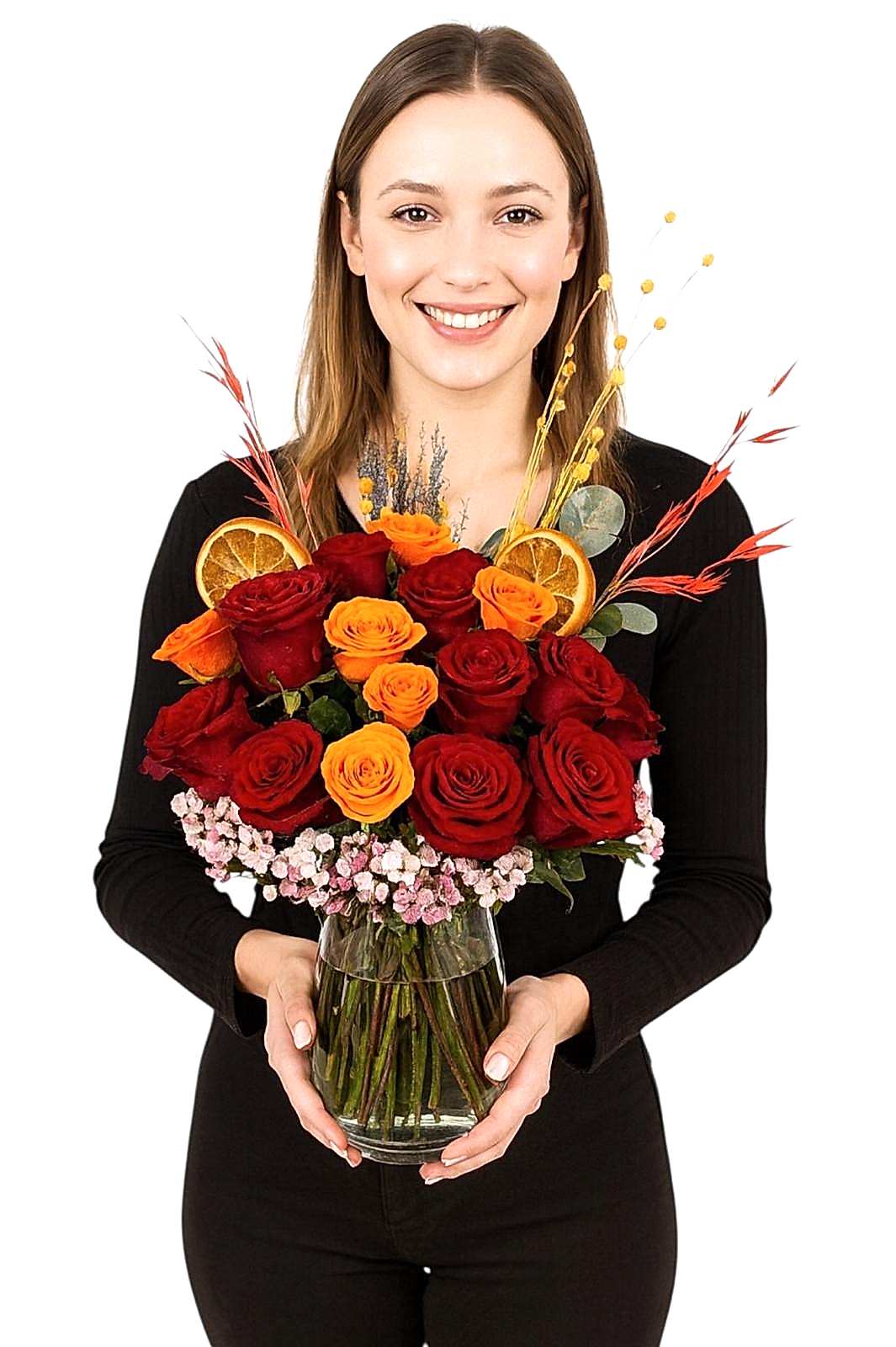 Kırmızının tutkusunu, turuncunun enerjisini ve doğal portakal dilimlerinin ferah dokusunu bir araya getiren bu özel aranjman; hem romantik hem de modern bir hediye seçeneği sunar.