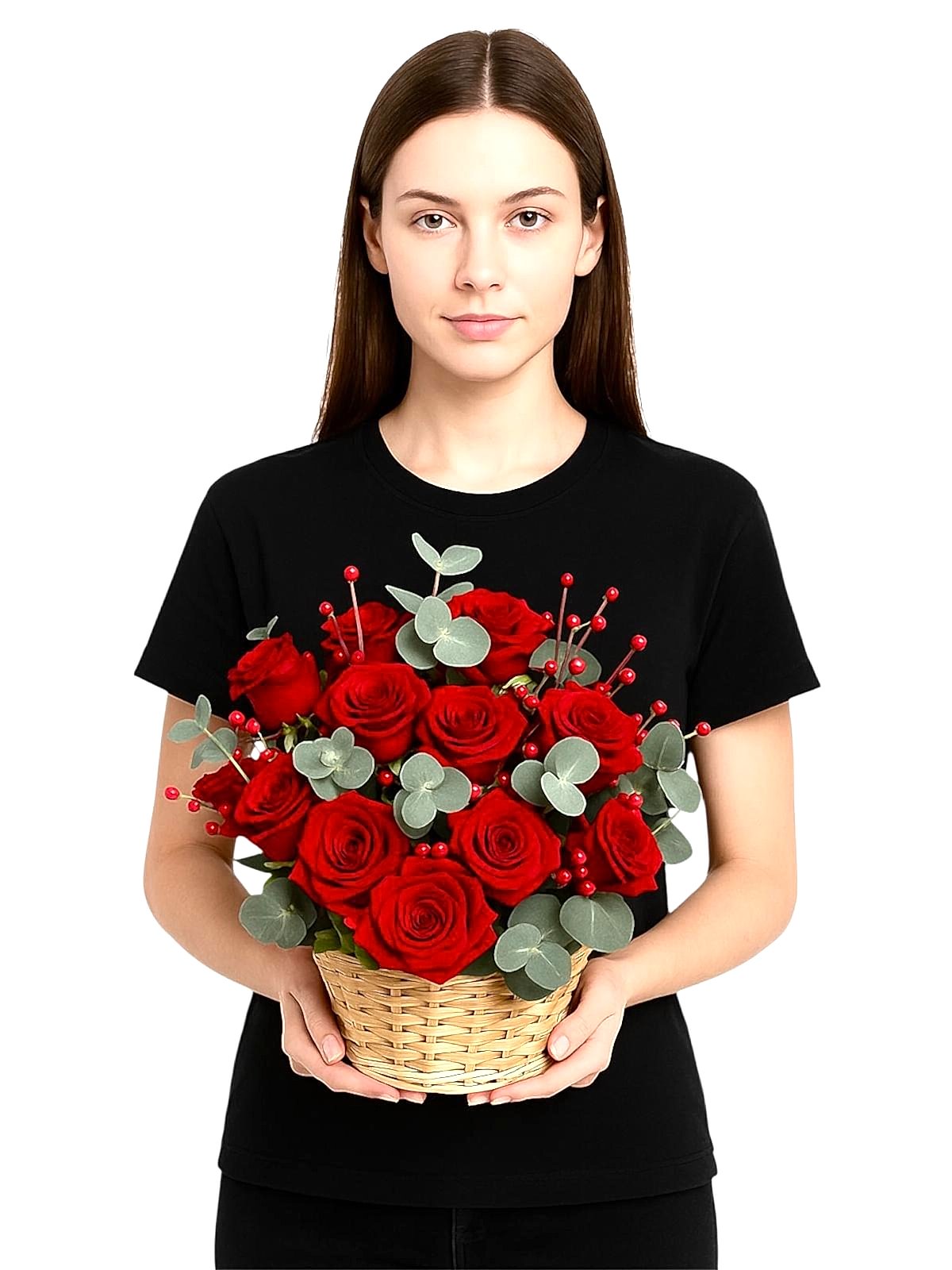 Doğallık ve romantizmi bir araya getiren bu özel aranjman, hasır sepet içerisinde özenle yerleştirilmiş canlı kırmızı güller ve ferahlatıcı okaliptus yaprakları ile hazırlanmıştır.