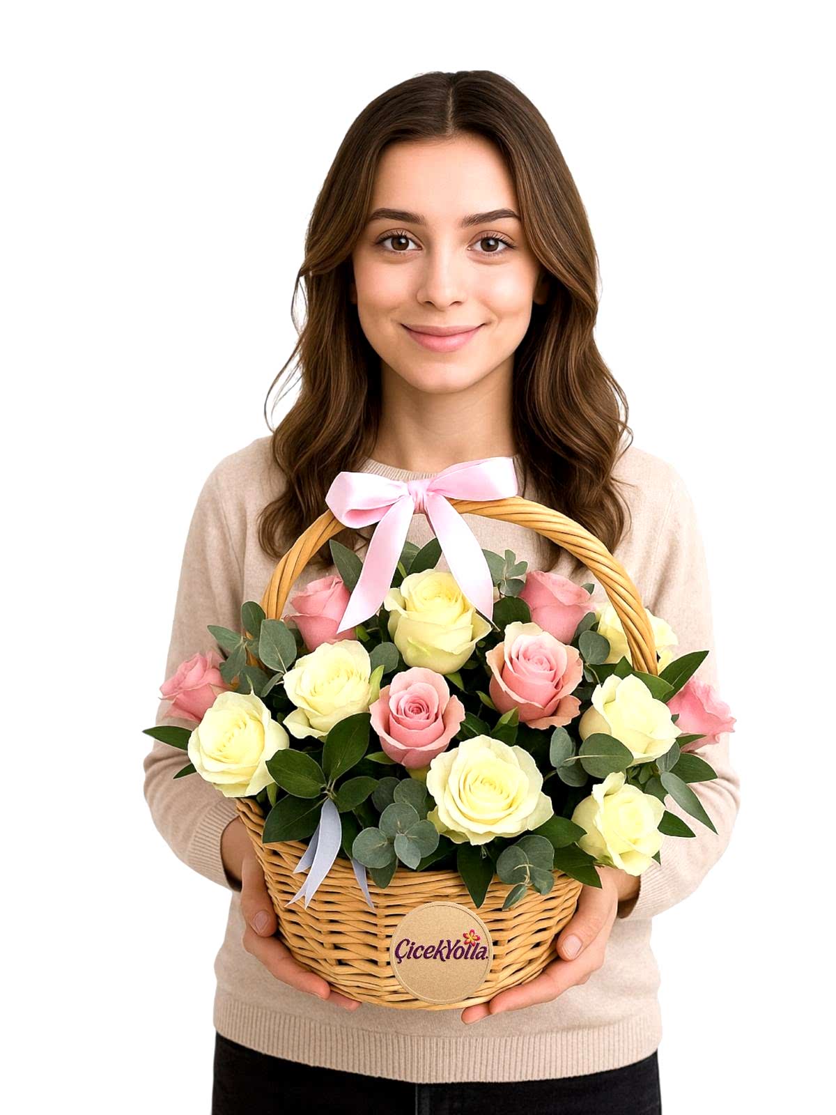 Zarif renk geçişleri ve doğal dokusuyla öne çıkan bu özel aranjman, pembe ve krem güllerin uyumunu şık bir hasır sepet içerisinde sunar. Soft tonları sayesinde hem romantik hem de sade bir etki yaratır. Sepetin üzerindeki pembe kurdele detayı ürüne sıcak ve samimi bir hava katar.
