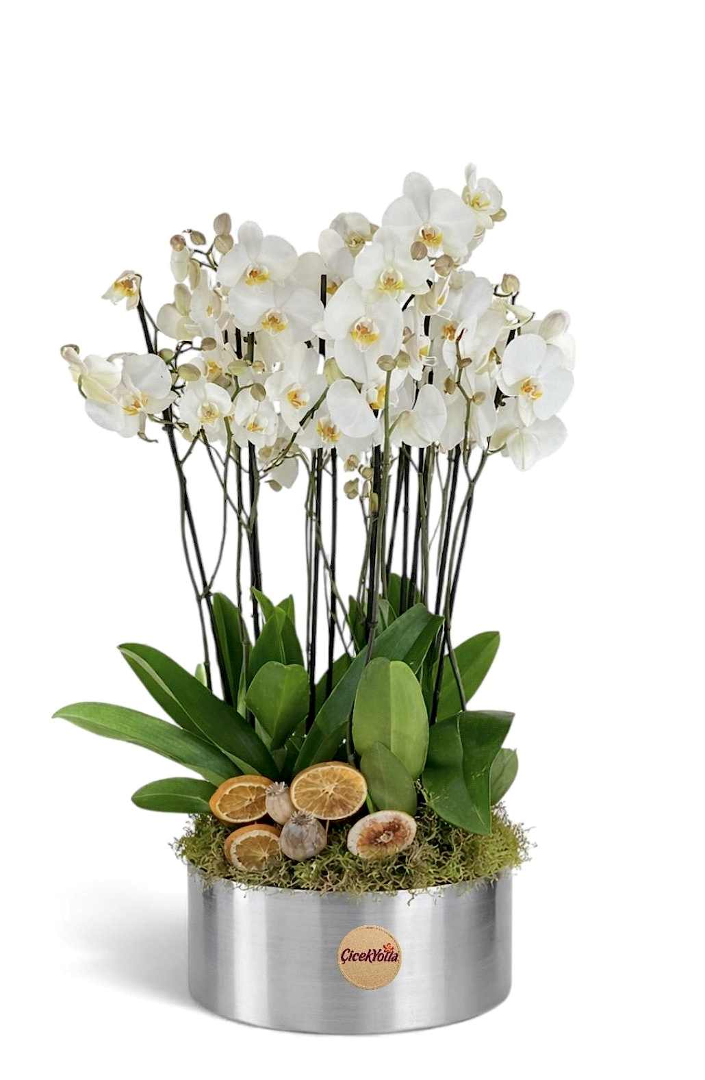 Zarafetin ve sadeliğin en şık hali olan bu beyaz Phalaenopsis orkide aranjmanı, çok dallı yapısıyla bulunduğu ortama ferahlık ve prestij katar. Canlı beyaz orkide çiçekleri, metal saksı içerisinde doğal yosun zeminiyle buluşturulmuş; kurutulmuş portakal dilimleri ve doğal detaylarla zenginleştirilmiştir.