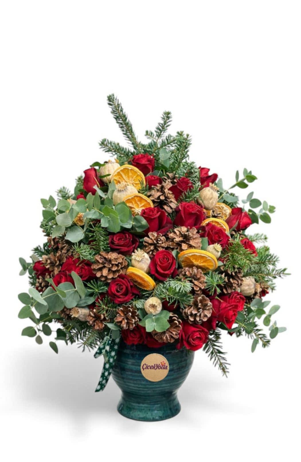 Doğanın sıcak tonlarını ve kırmızı güllerin romantik etkisini bir araya getiren bu özel aranjman, yılbaşı ruhunu ve kış mevsiminin zarafetini yansıtan güçlü bir tasarımdır. Canlı kırmızı güller; doğal çam kozalakları, okaliptus dalları, çam yeşillikleri ve kurutulmuş portakal dilimleriyle özenle hazırlanmıştır.