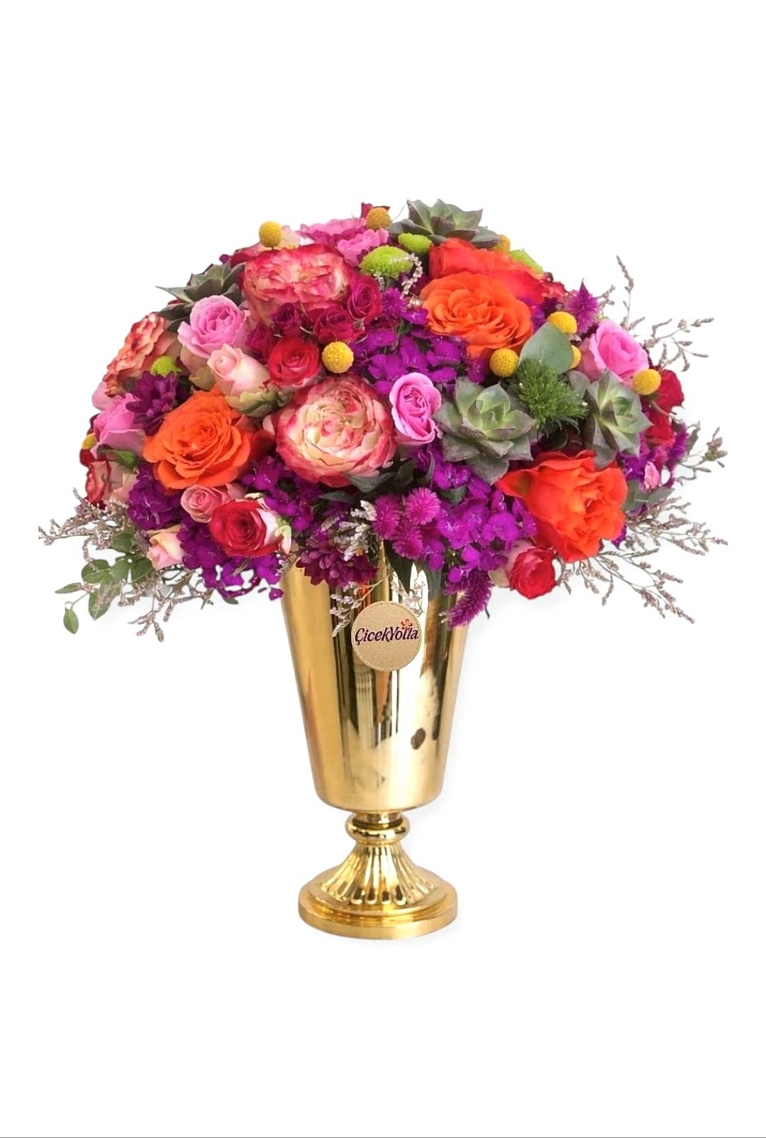 Canlı renklerin zarafetle buluştuğu bu özel tasarım; pembe, turuncu ve kırmızı tonlardaki güllerin, mor mevsim çiçeklerinin ve dekoratif sukulentlerin uyumuyla hazırlanmıştır. Altın renkli metal ayaklı vazo, aranjmana lüks ve göz alıcı bir karakter kazandırır. Doğal yeşillikler ve minik sarı detaylar tasarımı zenginleştirerek hacimli ve gösterişli bir görünüm sunar.
