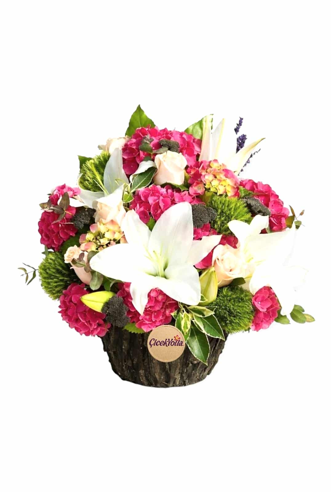 Beyaz zambakların zarafeti, fuşya ortancaların canlı enerjisi ve krem tonlu güllerin romantik dokunuşuyla hazırlanan bu özel aranjman; doğal yeşillikler ve dekoratif detaylarla zenginleştirilmiştir. Koyu tonlu doğal saksısı sayesinde modern ve güçlü bir duruş sergilerken, çiçeklerin renk uyumu göz alıcı bir bütünlük sunar.