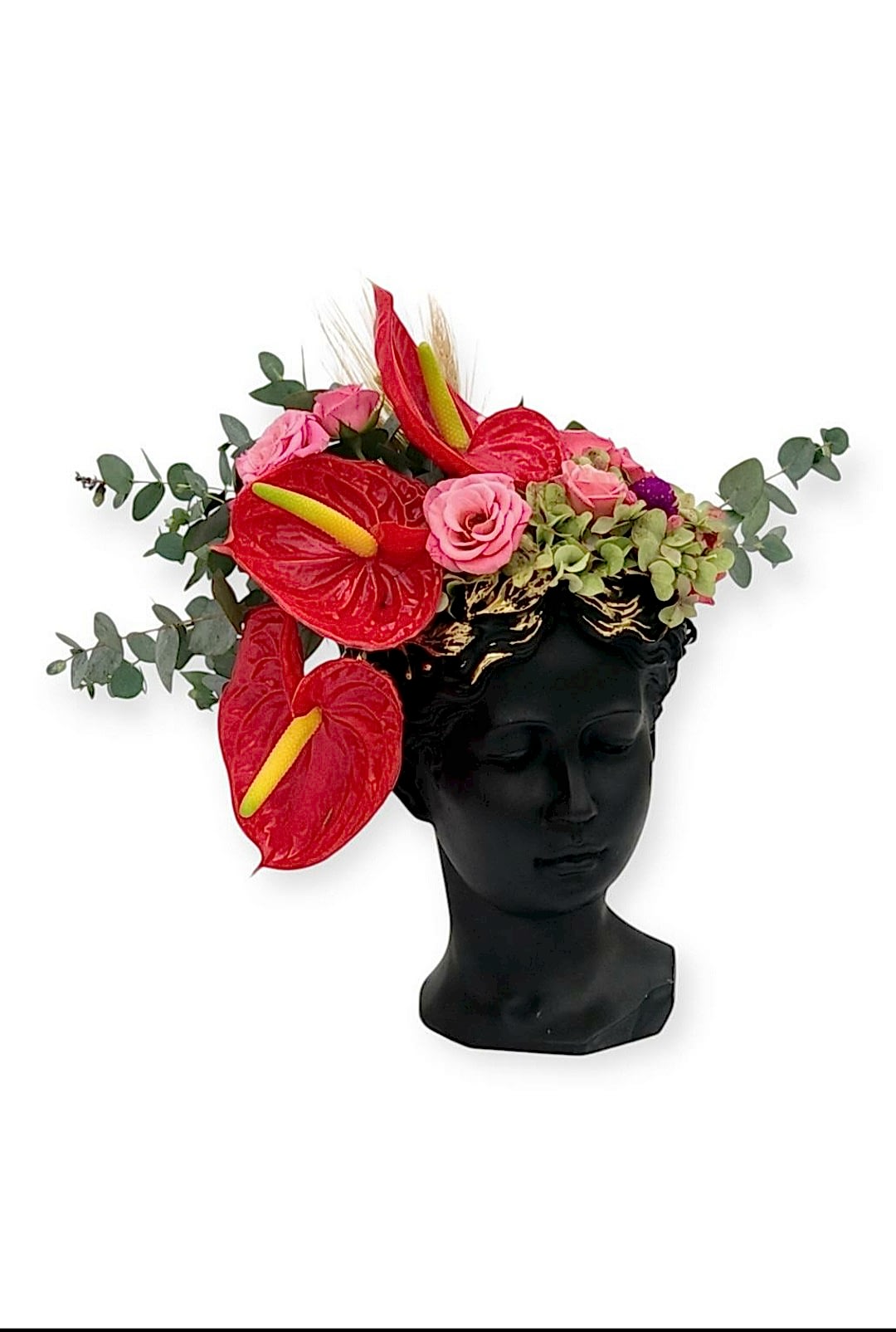 Modern sanat estetiğinden ilham alınarak hazırlanan bu özel aranjman, siyah büst formundaki dekoratif saksı içerisinde canlı kırmızı antoryumlar ve zarif pembe güllerle tasarlanmıştır. Antoryumların güçlü ve parlak kırmızı dokusu, pembe güllerin yumuşak romantik tonlarıyla dengelenerek çarpıcı ve sofistike bir görünüm sunar.