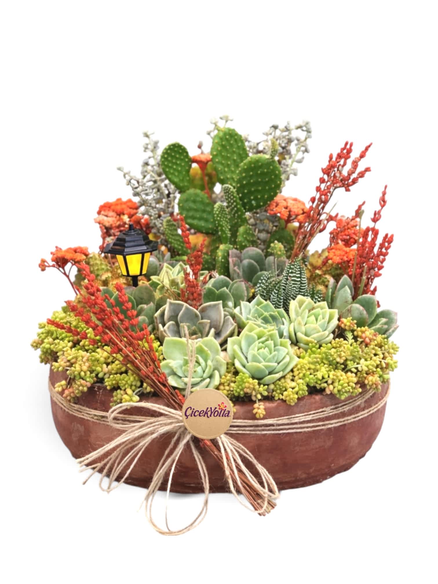 Doğal sukulentler ve kaktüslerle hazırlanmış bu özel aranjman; canlı yeşil tonları, turuncu–kırmızı kuru çiçek detayları ve dekoratif fener objesiyle sıcak ve rustik bir görünüm sunar. Terakota saksısı ve naturel ip bağlaması sayesinde hem modern hem doğal dekorasyonlara uyum sağlar.