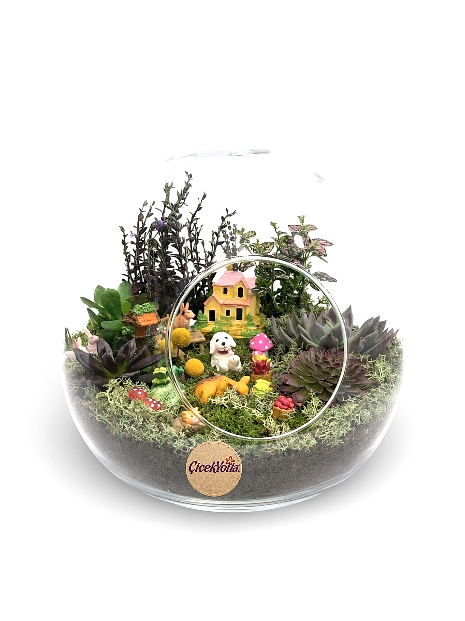 Geniş cam fanus içerisinde; sukulentler, doğal yosunlar ve sevimli minyatür figürlerle oluşturulmuş masalsı bir teraryum tasarımıdır. Ortadaki yuvarlak pencere formu sayesinde derinlik hissi kazandırır ve iç mekânı adeta küçük bir doğa sahnesine dönüştürür.