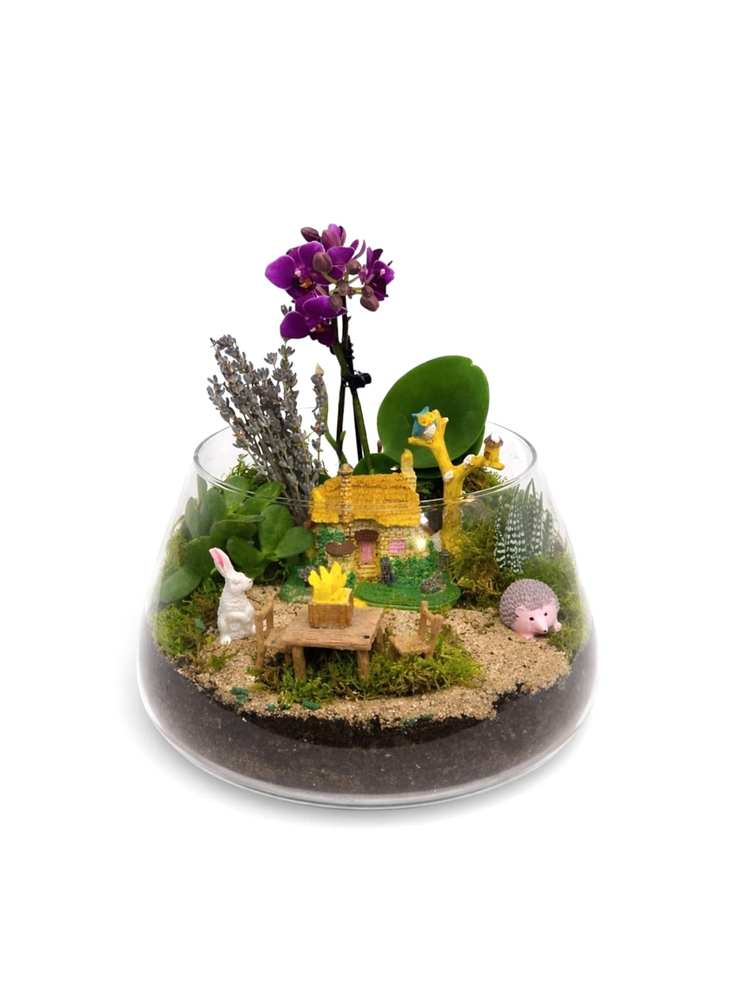 Cam fanus içerisinde mor mini orkide, canlı bitkiler, doğal yosun ve sevimli hayvan figürleriyle hazırlanmış masal temalı teraryumdur. Dekoratif görünümüyle ev, ofis ve masaüstü kullanımı için idealdir. Özel günlerde fark yaratan, uzun ömürlü ve bakımı kolay bir hediye alternatifidir.