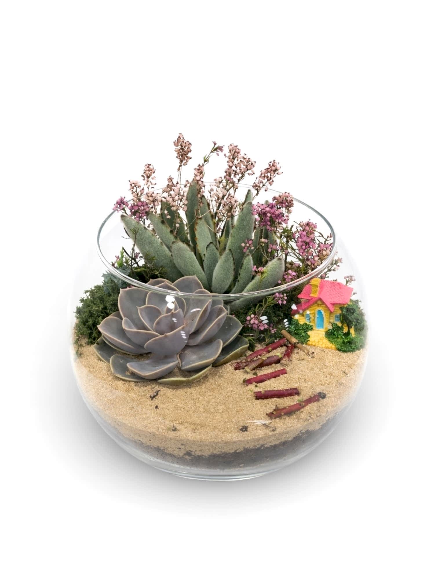 Cam fanus içerisinde farklı sukulent türleri, doğal kum, yeşil yosun ve minyatür ev detaylarıyla hazırlanmış dekoratif bir mini bahçe tasarımıdır. Doğal ve masalsı görünümüyle ev, ofis ve masaüstü alanlara sıcak bir hava katar. Bakımı kolaydır ve uzun süre formunu korur. Kalıcı ve anlamlı bir hediye alternatifi arayanlar için idealdir.