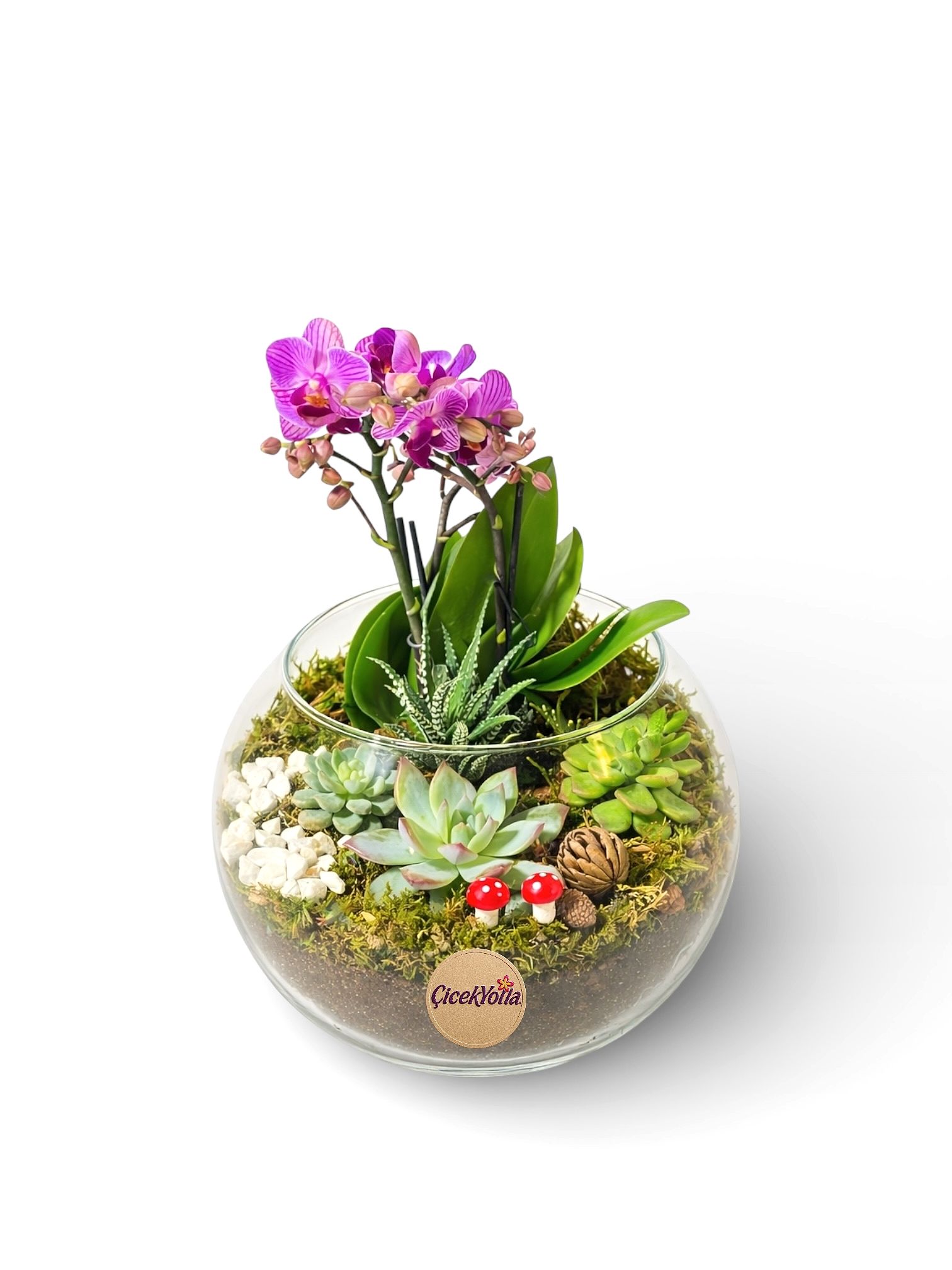 Cam fanus içerisinde mor mini orkide, sukulentler ve doğal yosunlarla hazırlanmış şık teraryum tasarımıdır. Dekoratif beyaz taşlar, kozalak ve mantar figürleriyle zenginleştirilmiş doğal bir kompozisyon sunar. Orkidenin zarif çiçekleri ile sukulentlerin dayanıklı yapısı bir araya gelerek uzun ömürlü ve estetik bir dekor oluşturur. Ev, ofis ve özel gün hediyesi olarak idealdir.