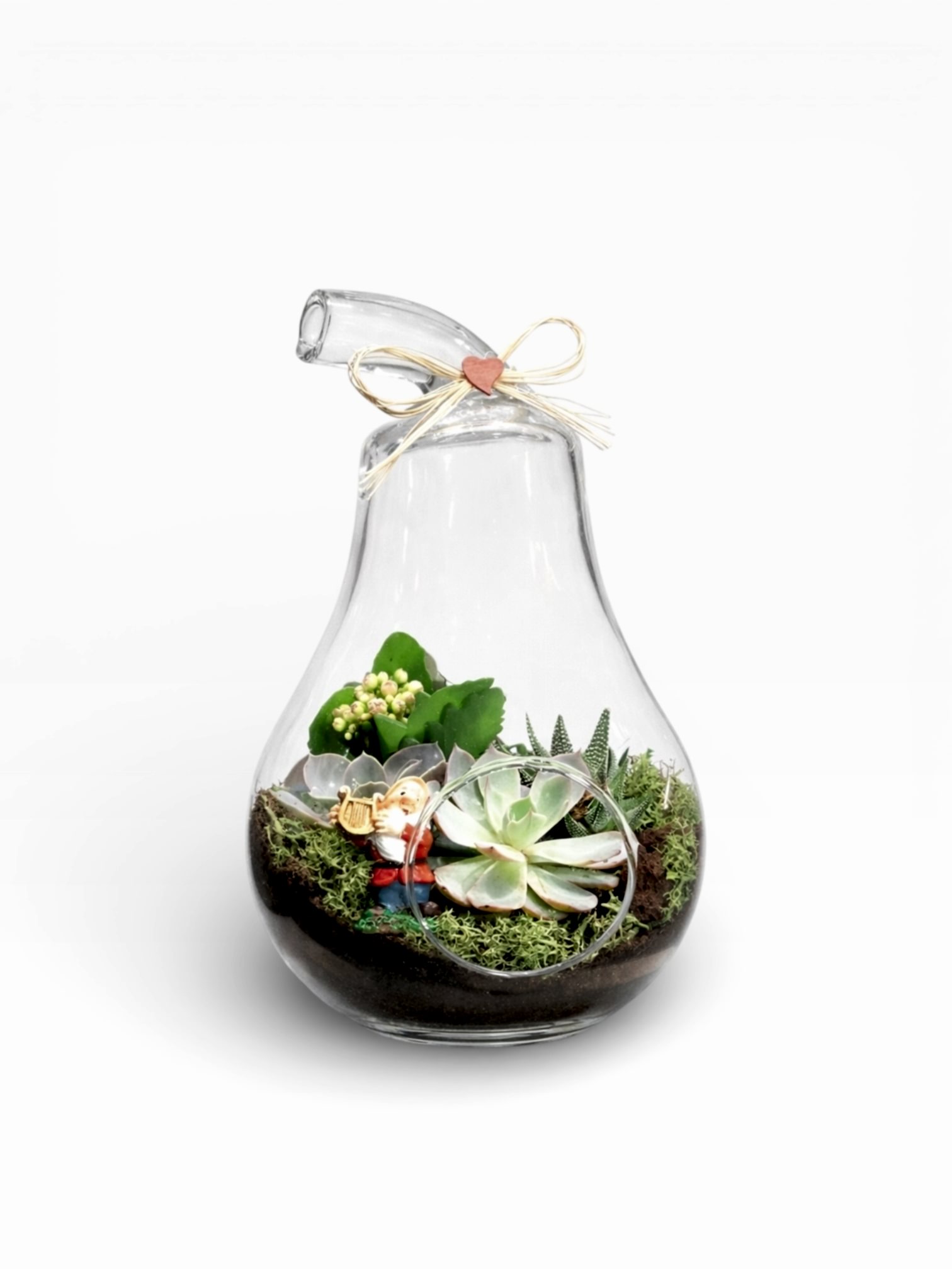 Kalpli Detaylı Armut Cam Teraryum, zarif armut formundaki şeffaf cam tasarımı ve özenle seçilmiş canlı bitkileriyle hem romantik hem de doğal bir dekoratif üründür. Cam teraryum içerisinde sağlıklı sukulent, mini kaktüs, yeşil yapraklı bitki, doğal yosunlar ve dekoratif toprak katmanları yer almaktadır.