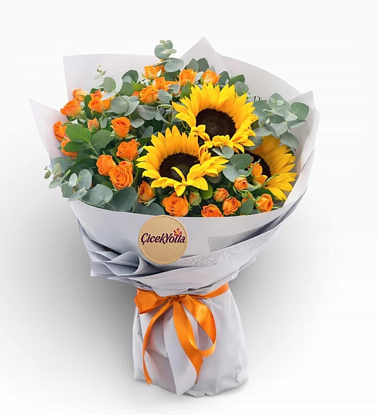 Canlı sarı ayçiçekleri ile enerjik turuncu mini güllerin uyumundan oluşan bu özel buket, mutluluk ve pozitif duyguları yansıtan güçlü bir çiçek tasarımı sunar. Doğal yeşillikler ve özenli ambalajla tamamlanan buket, dikkat çekici renkleriyle bulunduğu ortama sıcaklık katar.