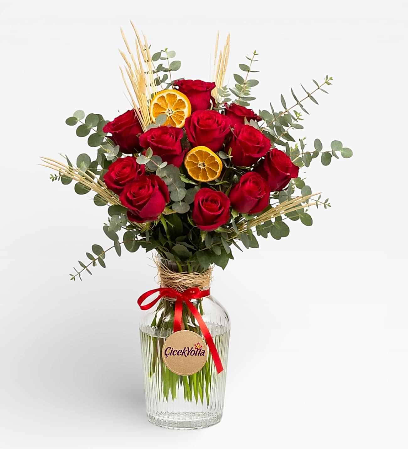 Aşkın ve zarafetin simgesi kırmızı güller, şeffaf cam vazo içerisinde modern ve doğal bir tasarımla bir araya getirilmiştir. Okaliptus yaprakları ve dekoratif kuru portakal dilimleriyle zenginleştirilen bu özel aranjman, güçlü renk kontrastı ve ferah görünümüyle dikkat çeker.