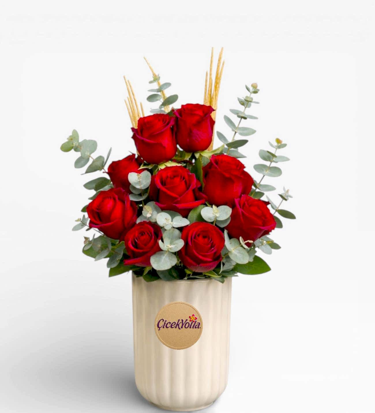 Aşkın ve zarafetin simgesi olan kırmızı güller, modern tasarımlı krem renkli vazo içerisinde şık bir aranjman hâline getirilmiştir. Doğal okaliptus yaprakları ve dekoratif kuru başak detaylarıyla zenginleştirilen bu tasarım, sade ama etkileyici bir görünüm sunar.