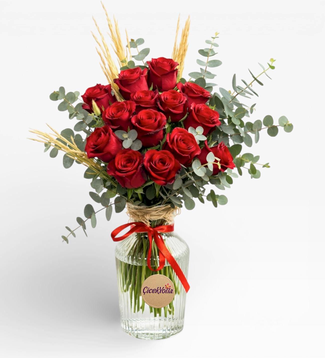 Aşkın ve tutkunun en güçlü ifadesi olan yoğun kırmızı güller, şeffaf cam vazo içerisinde zarif ve dengeli bir kompozisyonla bir araya getirilmiştir. Doğal okaliptus yaprakları ve dekoratif kuru başak detayları, aranjmana modern ve doğal bir karakter kazandırır.