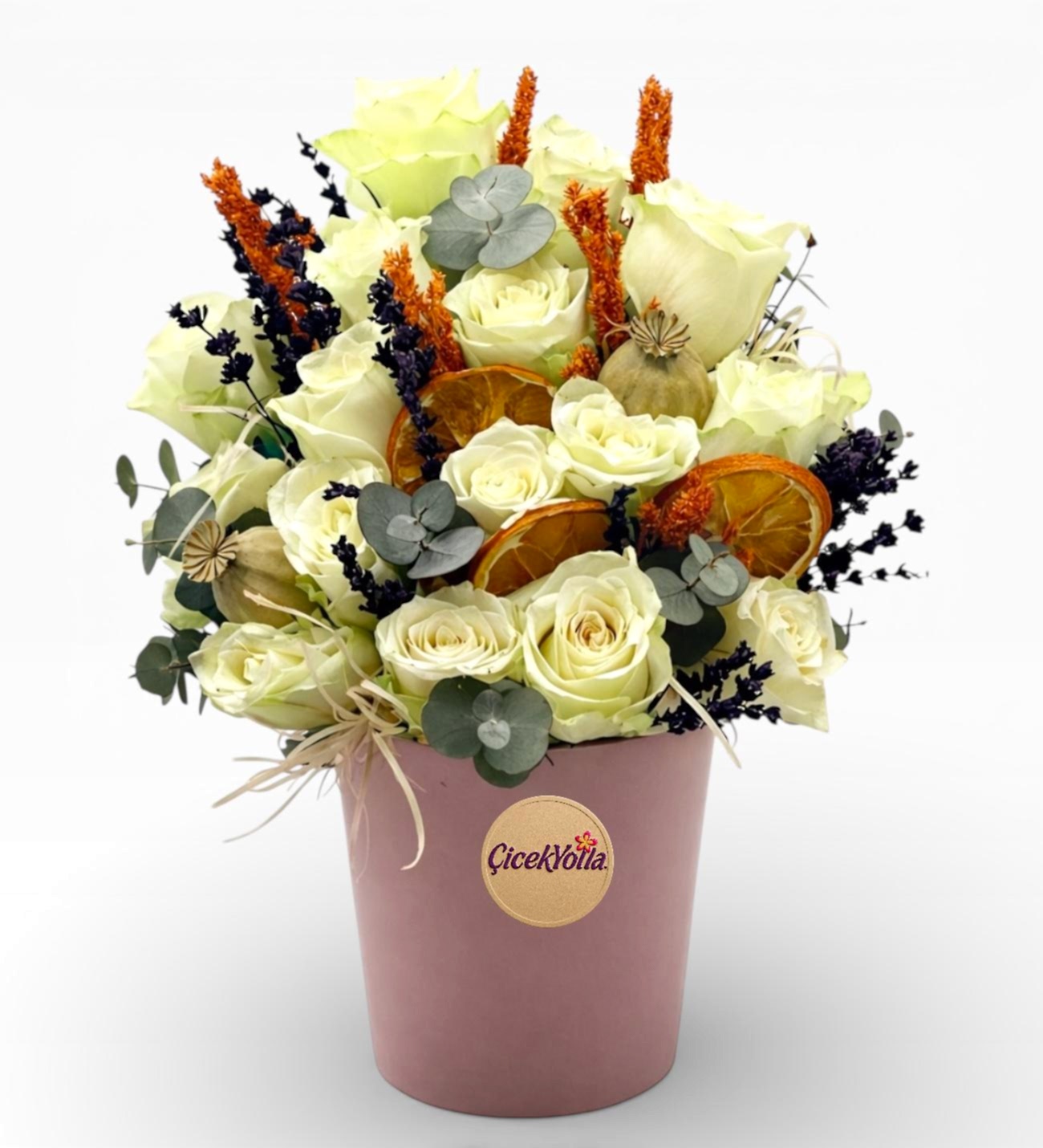 Saflığın ve zarafetin simgesi beyaz güller, doğal okaliptus yaprakları, kurutulmuş portakal dilimleri ve dekoratif kuru çiçek detaylarıyla bir araya getirilerek bu özel tasarım kutu aranjman hazırlanmıştır. Yumuşak renk geçişleri ve doğal dokular, ürüne hem modern hem de sıcak bir karakter kazandırır.